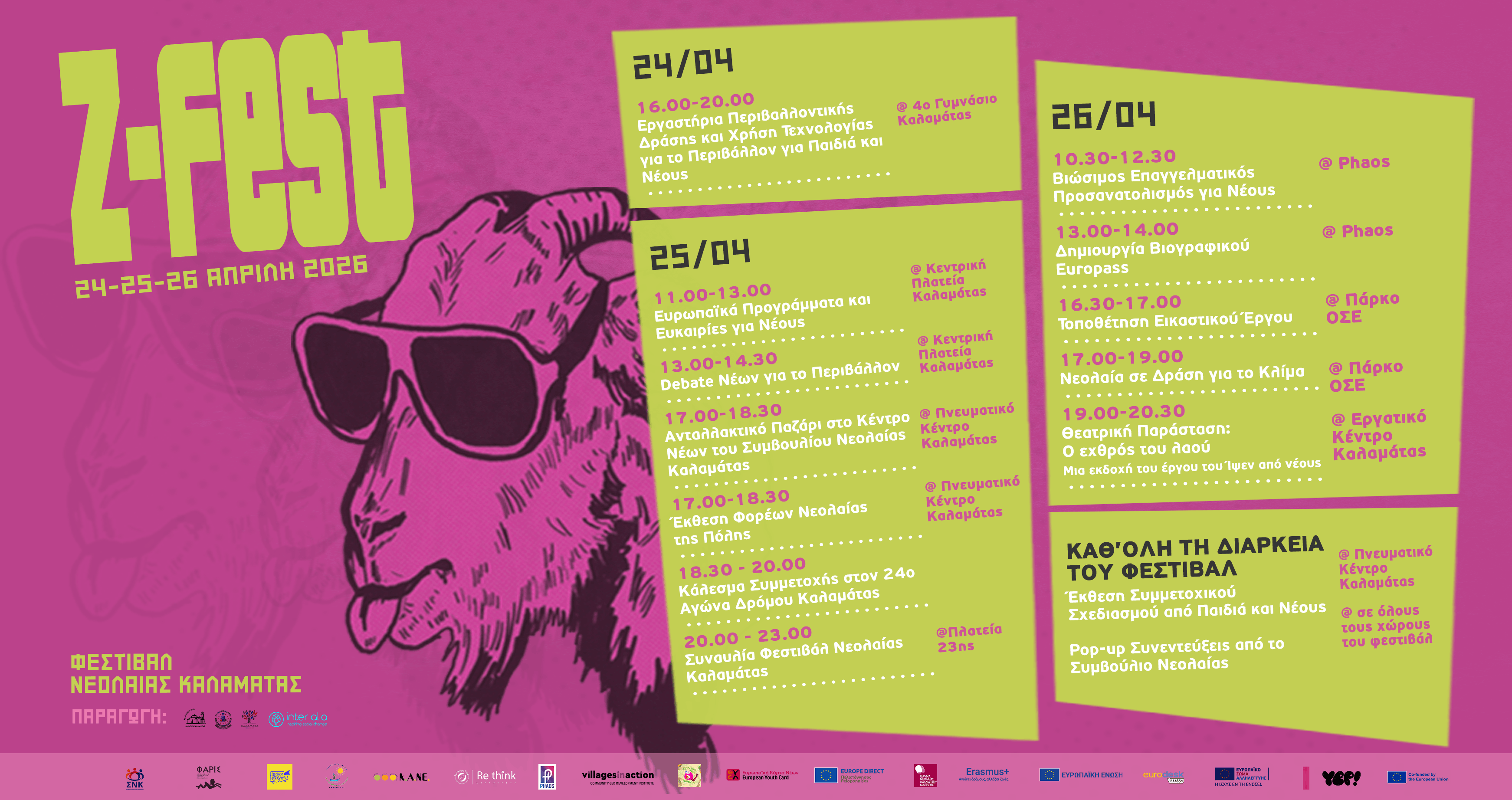 Θα θέλαμε να σας ενημερώσουμε ότι το Φεστιβάλ Νεολαίας Καλαμάτας Z-FEST ξεκινά και θα πραγματοποιηθεί από 24 έως 26 Απριλίου 2026 στην Καλαμάτα!