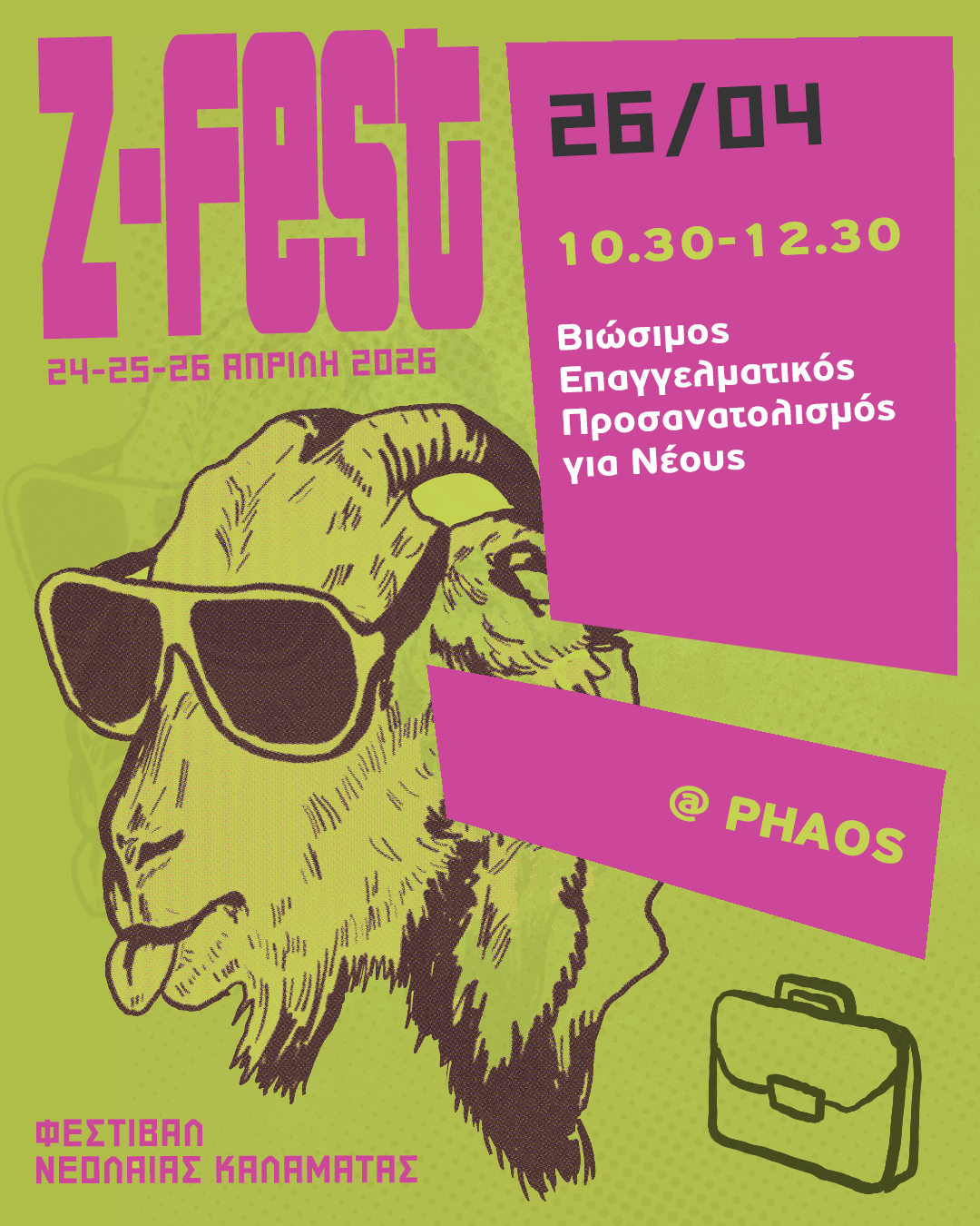 ✔️ Το 1ο εργαστήριο αφορά τον Βιώσιμο Επαγγελματικό Προσανατολισμό και θα πραγματοποιηθεί την Κυριακή 26 Απριλίου 2026, 10:30-12:30 Phaos (Διεύθυνση: Σφακτηρίας 18, 24 133 Καλαμάτα). Φόρμα συμμετοχής: https://forms.gle/knyXeFHTC5BRK4RJ6